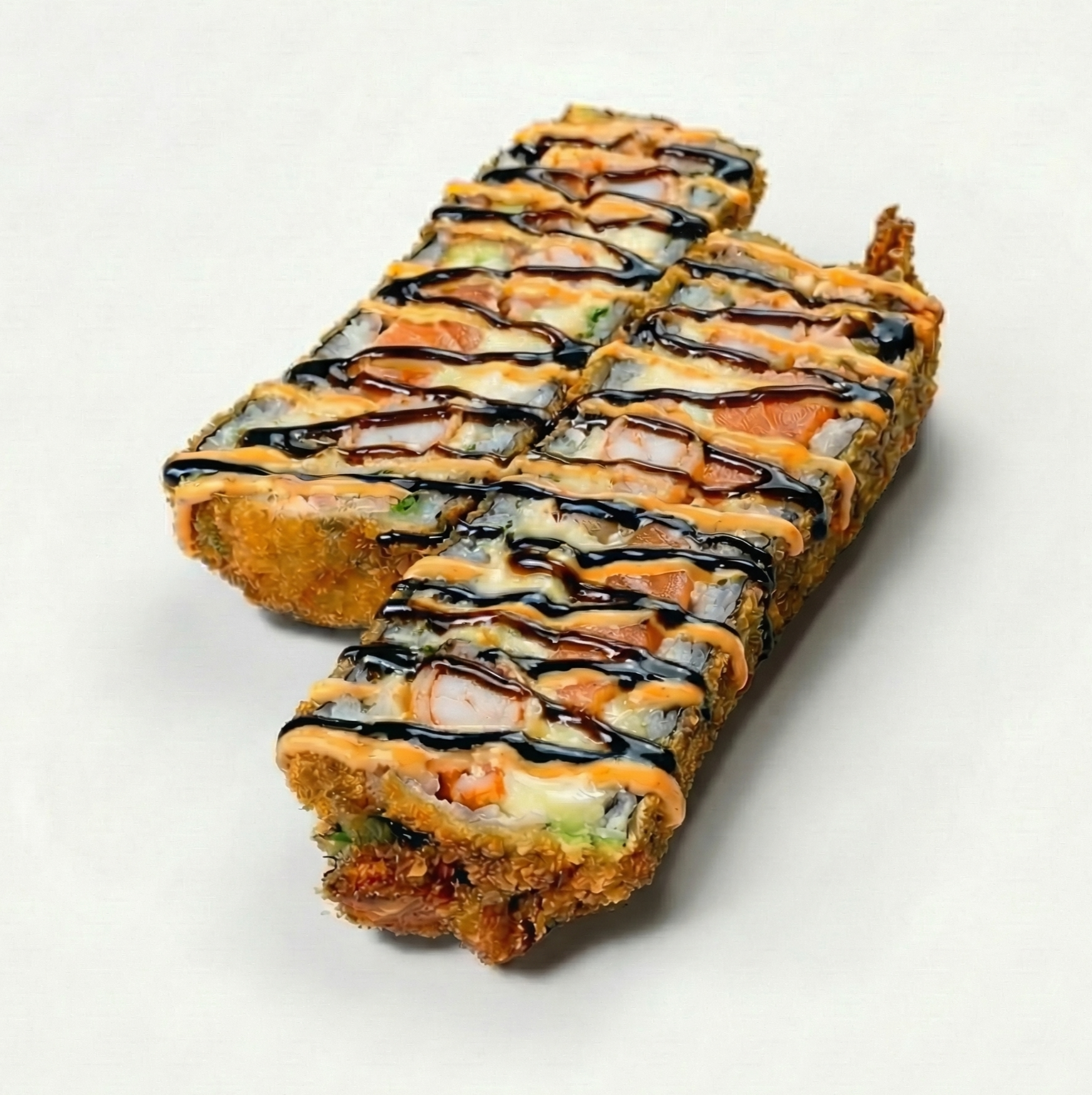 Жаренный ролл. Креветка, тонко нарезанный Лосось, Огурец, Майонез, Сливочный сыр «Hochland»