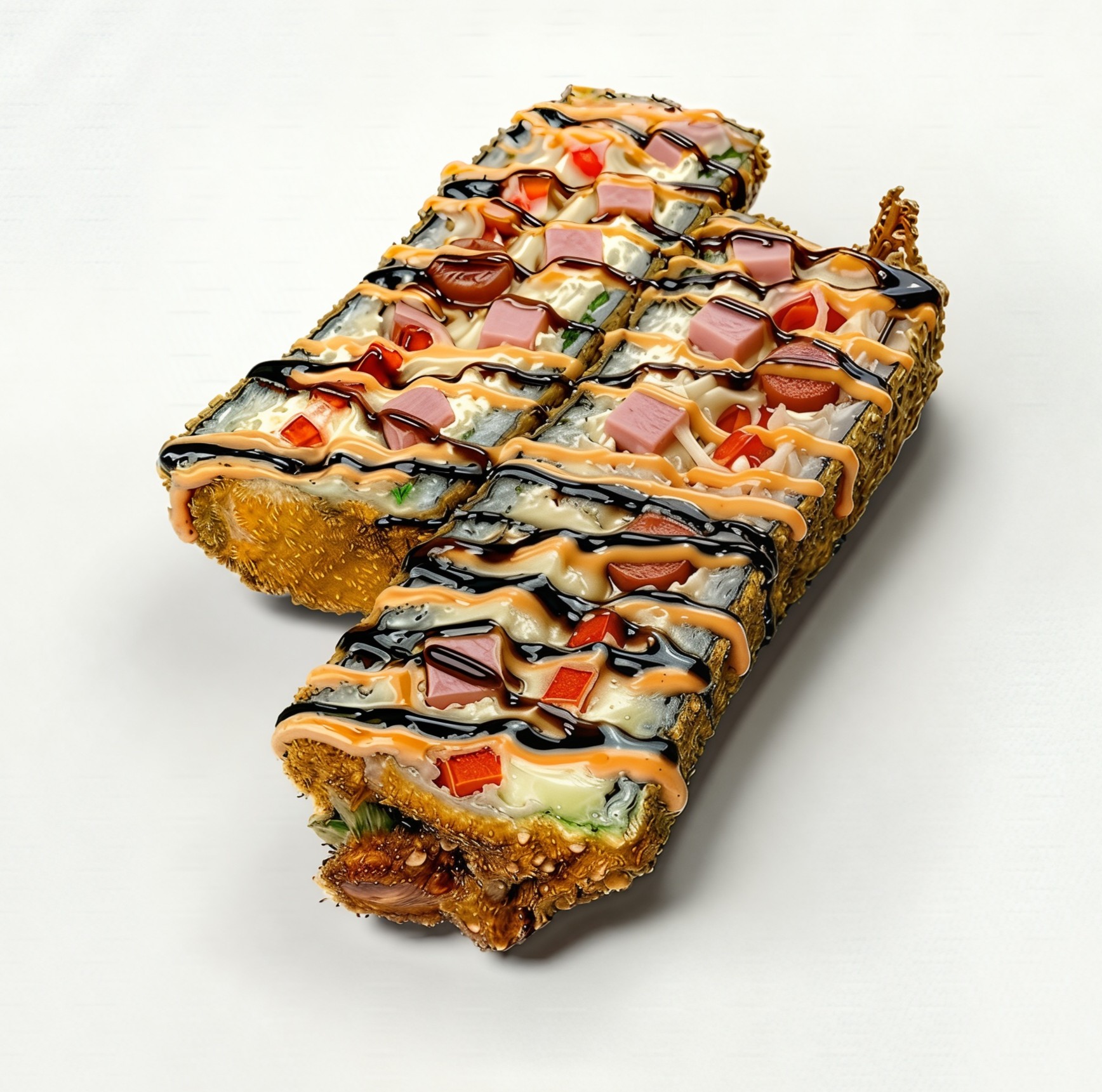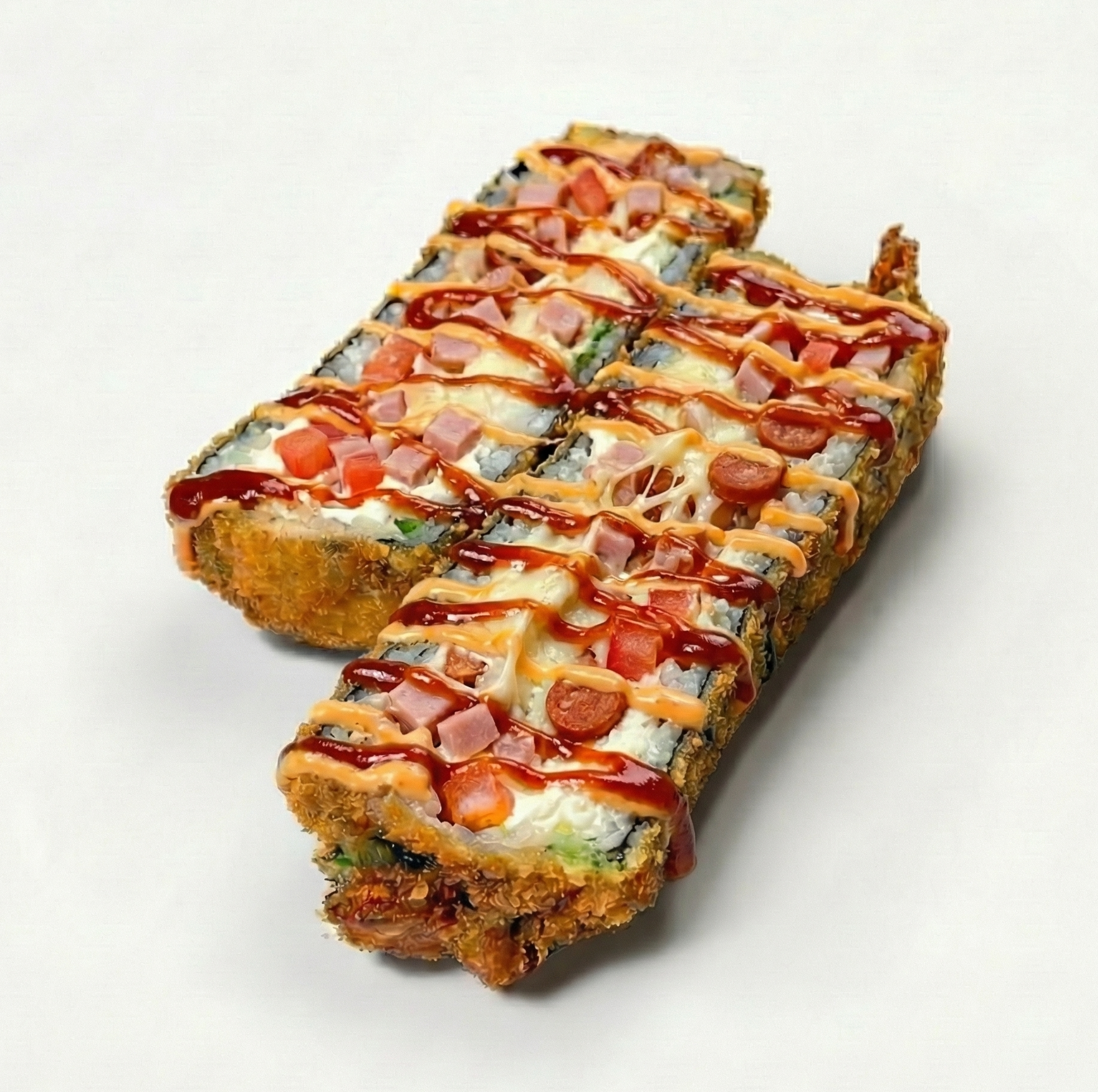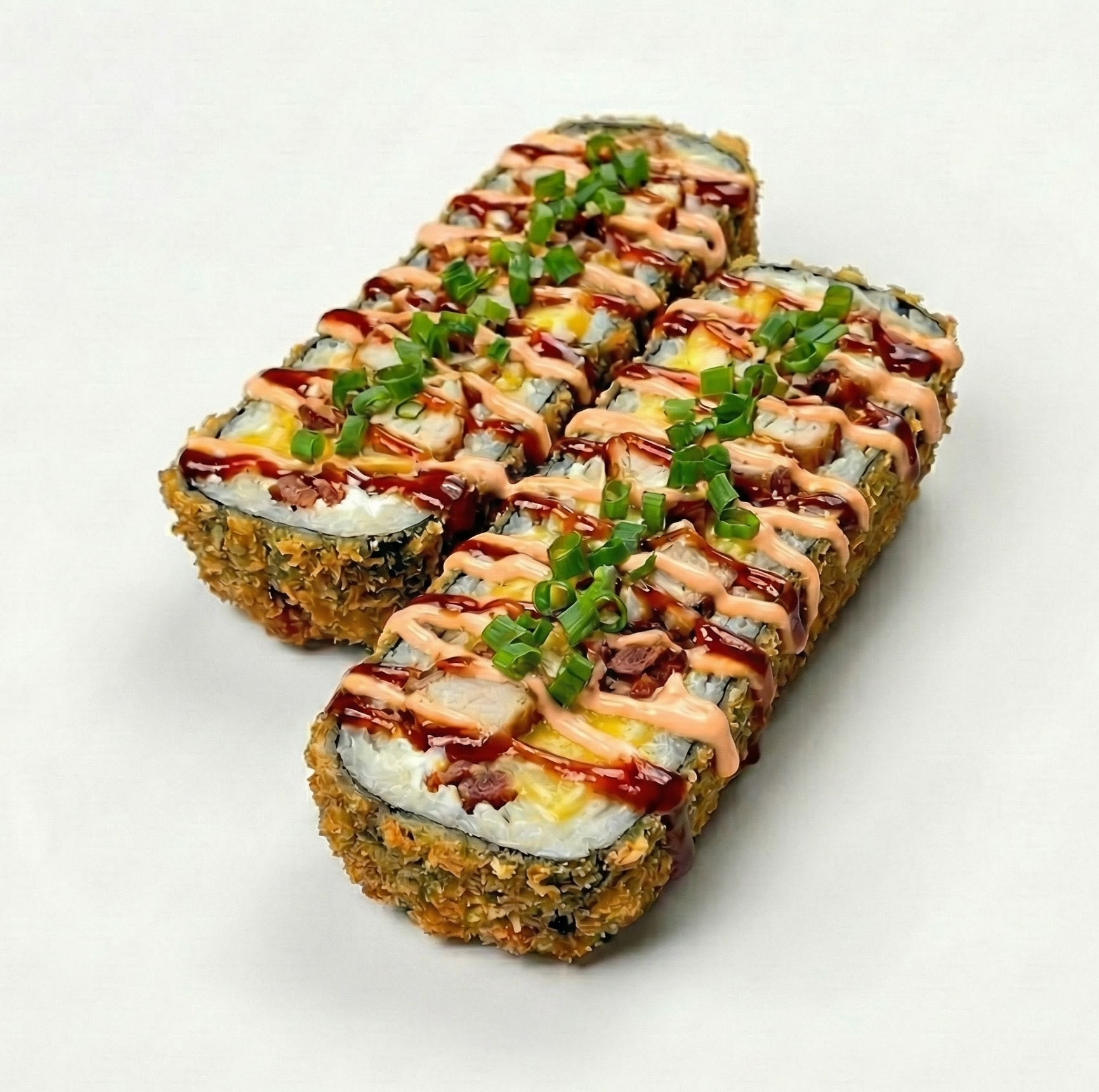 Творожный сыр "Hochland", копченый тунец, креветки, соус спайс. Состав включает в себя в том числе и шапочку ролла. Ролл с остринкой.